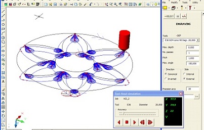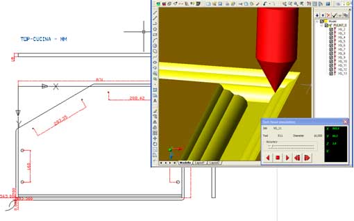 A megmunkálások szerkesztése során, a szerszám pályák és a megmunkáló fejek szimulációjával, valamint a panel 3D-s tömör nézetének megjelenítésével és keringetésével, folyamatosan figyelemmel kísérheti a megmunkálások helyességét.