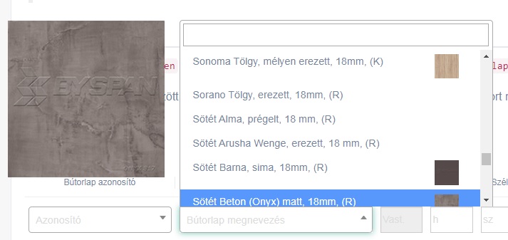 A megrendelés rögzítése során legördülő listából választhatóak a tételek a lapszabászat aktuális kínálatában szereplő termékekből, melyek a KORPUS gyártás-előkészítő rendszerből automatikusan szinkronizálhatóak, akár a termék megjelenését szemléltető, választást segítő képekkel kibővítve.