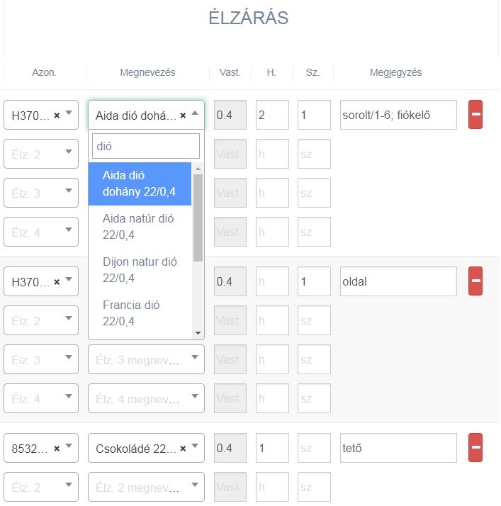 Minden elemhez egyedi élzárás kérhető, figyelembe véve a gyártó élzárásra vonatkozó feltételeit, illetve a gyártó által beállított élzáró ajánlásokat (melyeket a lista tetejére sorolva, piros színnel kiemelve jelenítünk meg, az élzáró választás megkönnyítése érdekében). A gyártó által meghatározható a minimum élzárható méret, mely alatti elem esetében inaktív az élzáró választás.