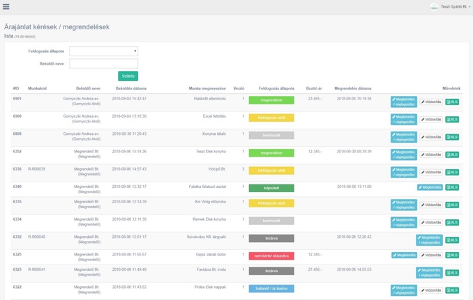 Az ajánlatkérések, megrendelések kezelése a listából történik, melyben lehetőség van az adott megrendelések áttekintésére, szűrésére, szerkesztésére, módosítására, másolására, új megrendelésbe illesztésére, illetve amelyben a megrendelések státuszai, aktuális állapotai nyomon követhetőek.