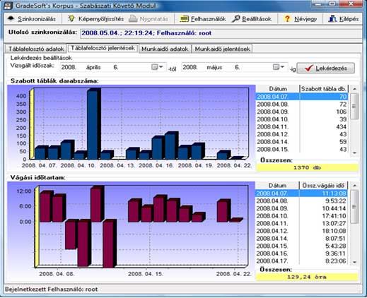Elemzéseket, kimutatásokat készíthet egy adott időszakban leszabott táblák mennyisége és a szabásra fordított idő vonatkozásában.